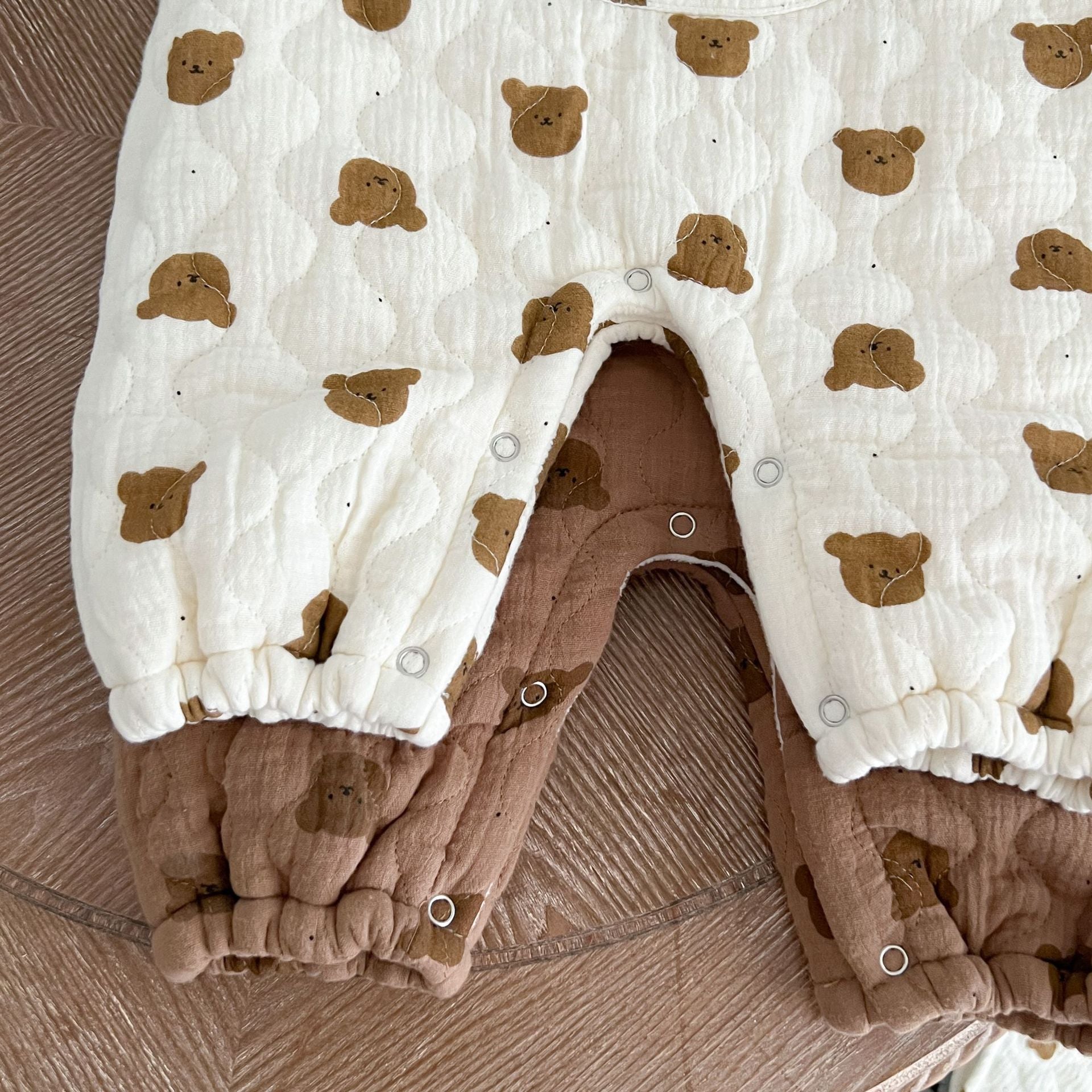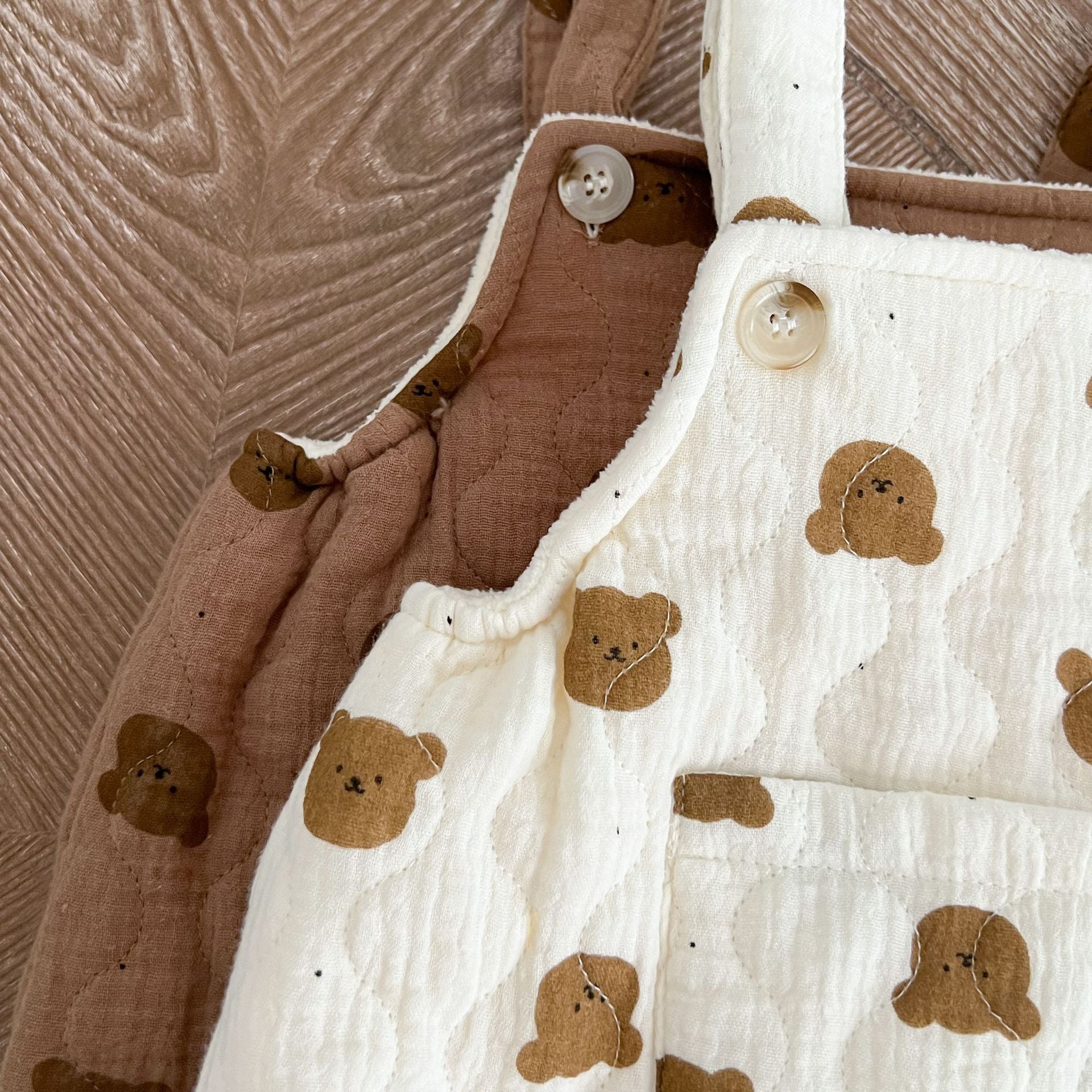 Bring adventure and excitement into your little one's wardrobe with this Baby Cartoon Bear Pattern Quilted Jumpsuit! Featuring a sleeveless design and warm quilted fabric, this cozy jumpsuit is sure to keep them comfortable and ready for any daring escapades. Complete with a cute bear-shaped hat, your child will look stylish and unstoppable!