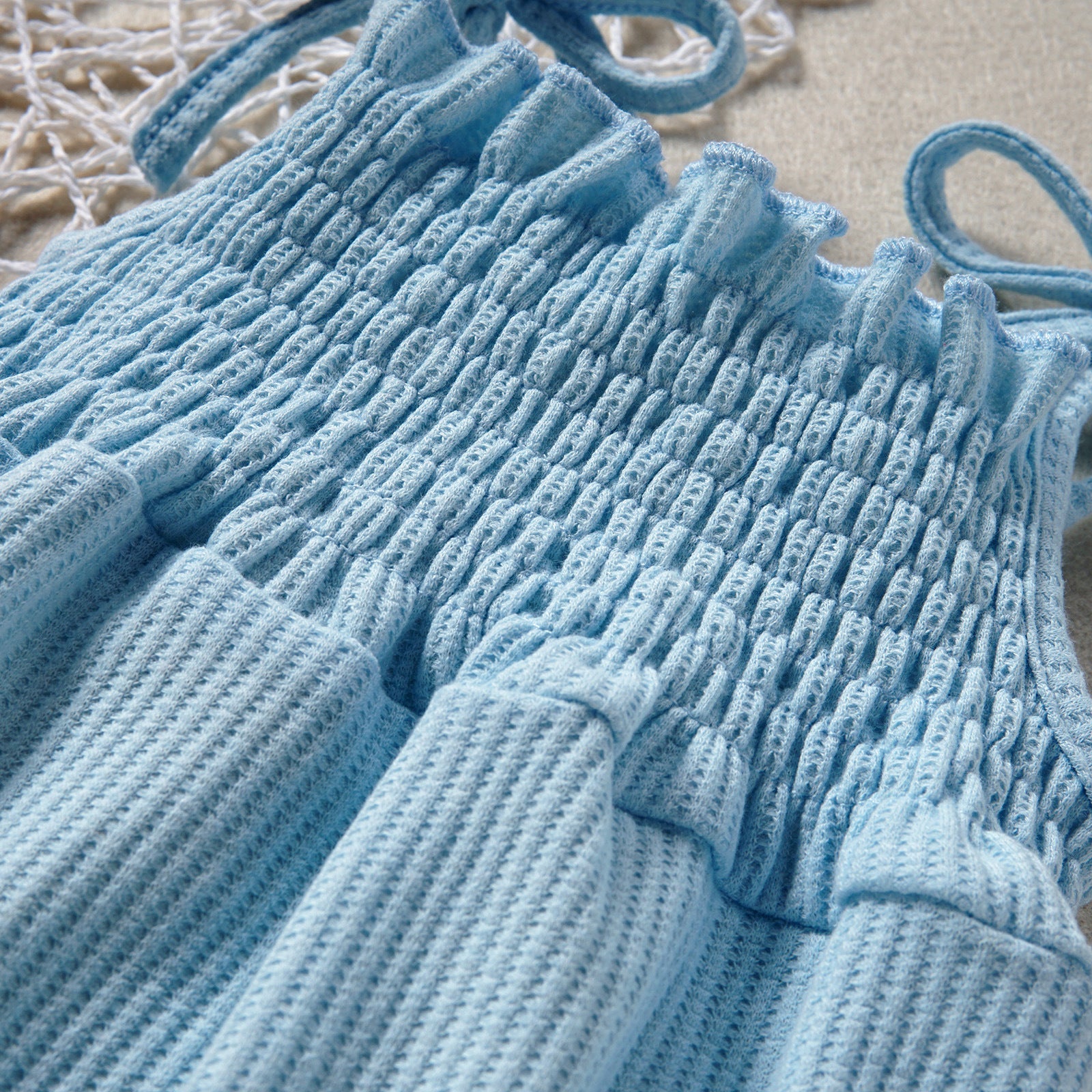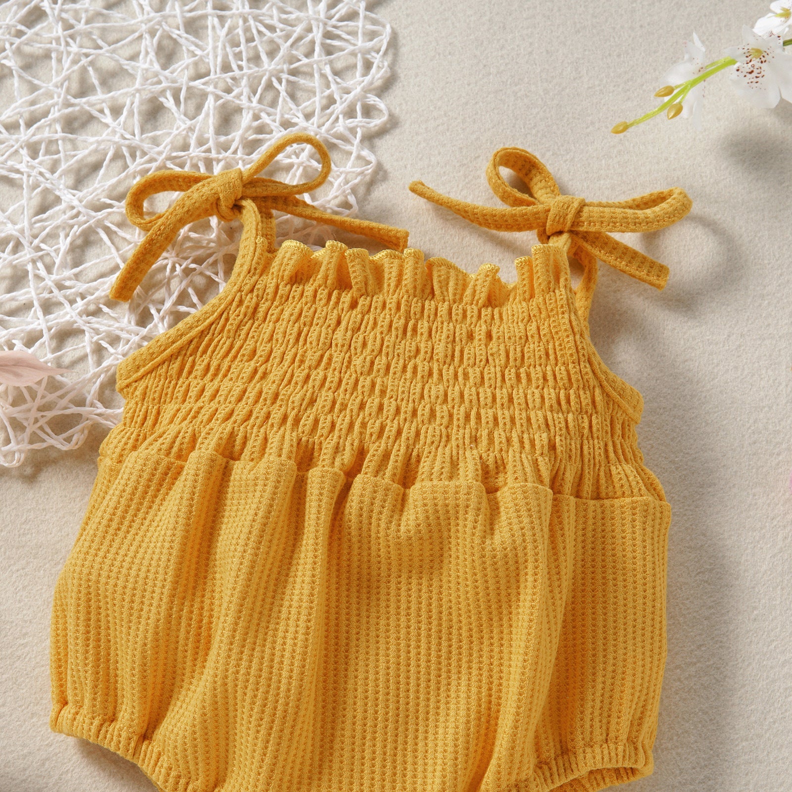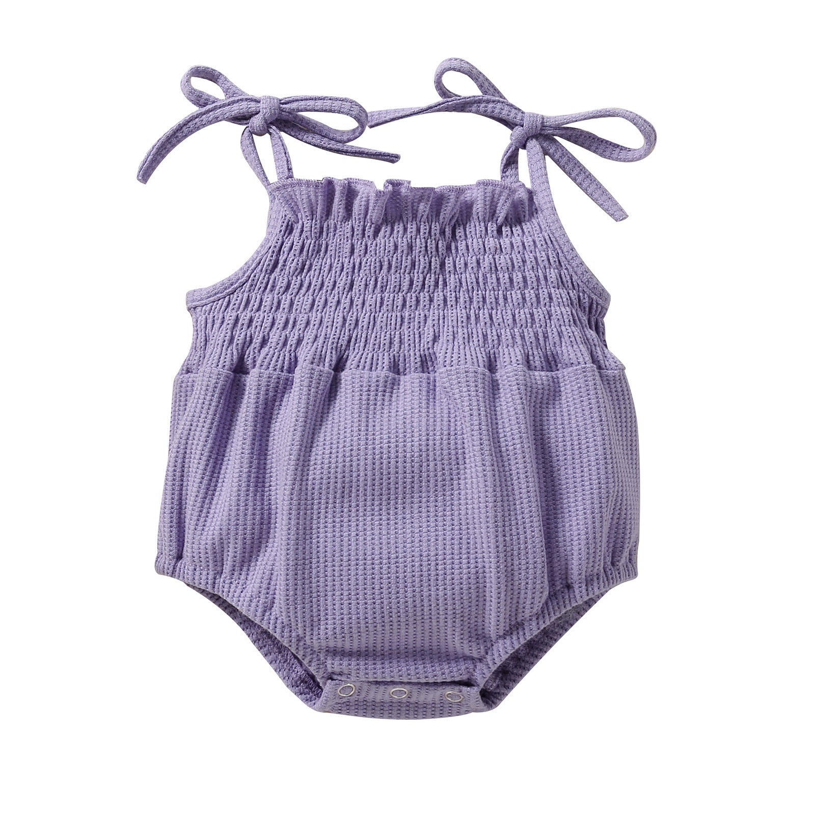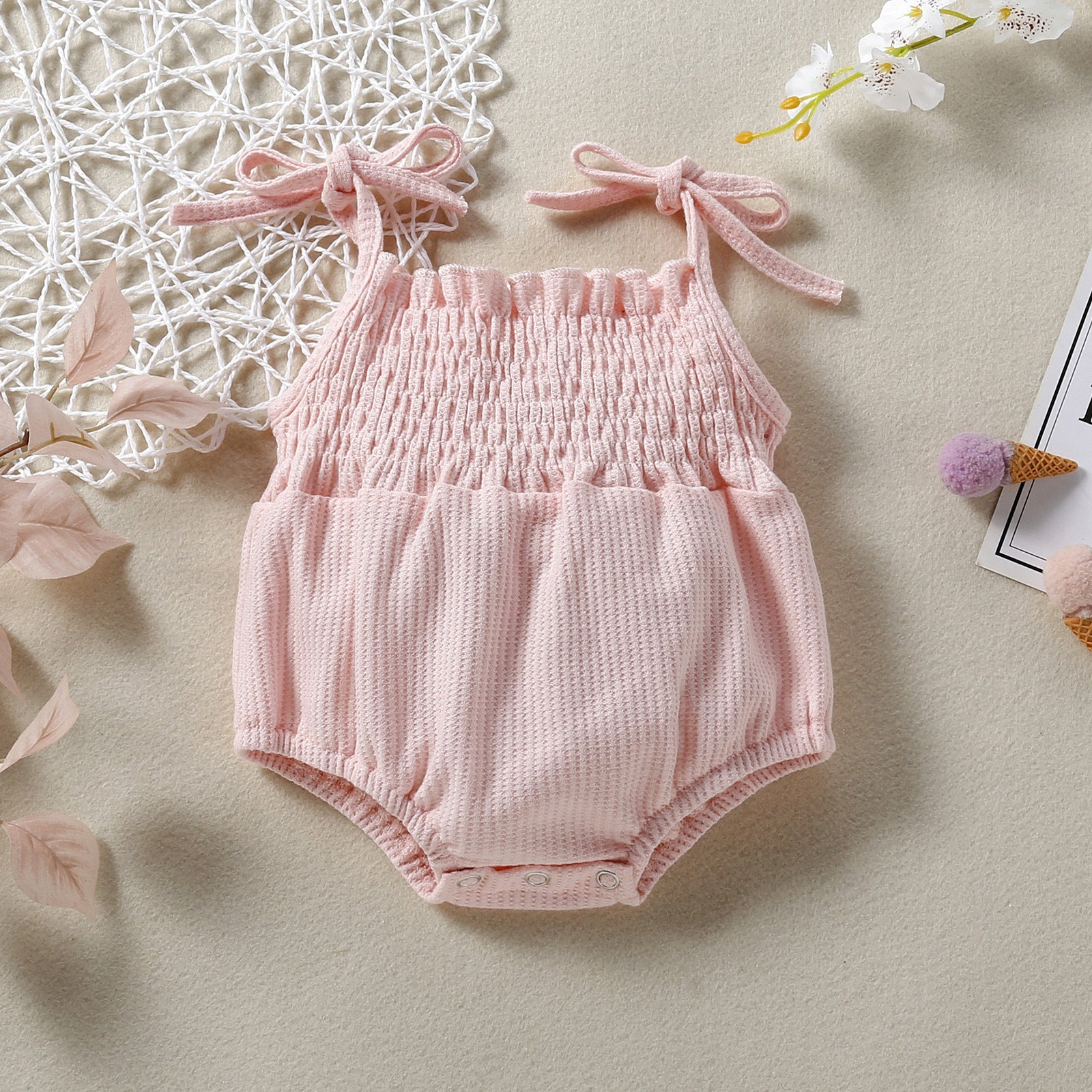 Baby Girl 1pcs Solid Colid Waffle Knitted Fabric Belted Sleeveless Onesies