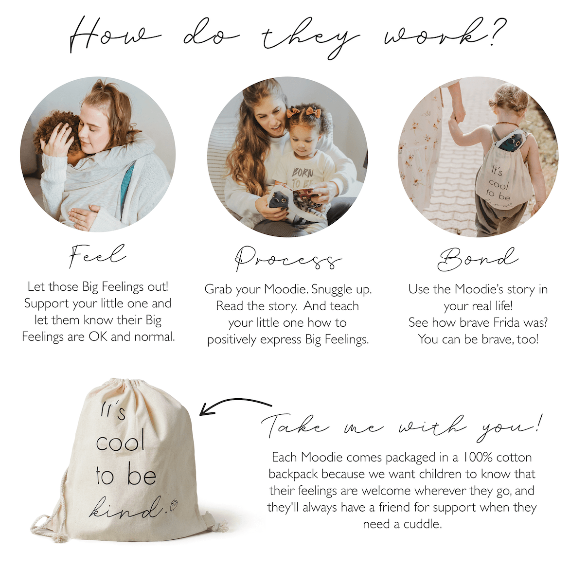 Your little one has Big Feelings but only small words to describe them. When those words fail them, it triggers frustration and meltdowns. The award-winning Moodies from Owl & Oak are an all-in-one toy & book that makes it easy to earn about and communicate Big Feelings. Teach awareness and positive expression with Elliot, Frida, Penny, & their friends! Each Cuddly Storybook Friend was crafted along with early childhood development experts.Each Moodie comes with an "It's cool to be kind" backpack, and an audiobook file.